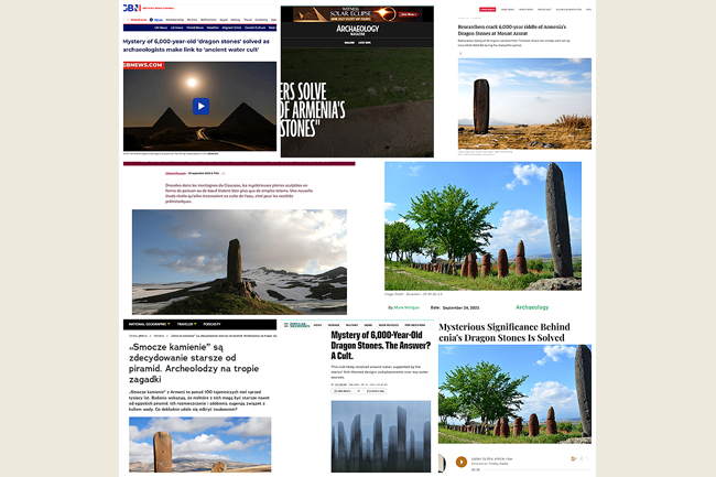 Հայկական լեռնաշխարհի 6000 տարվա պատմություն ունեցող վիշապաքարերի վերաբերյալ Հայաստանի գիտնականների բացահայտումների մասին հոդվածը մեծ հետաքրքրություն է առաջացրել միջազգային ասպարեզում: «6000-ամյա «վիշապաքարերի» առեղծվածը լուծվել է՝ հնագետները կապ են հաստատում «ջրի հնագույն պաշտամունքի» հետ», «Հնագիտության ոլորտում մեծ հայտնագործություն․ 6000 տարվա վաղեմության «վիշապաքարերի» առեղծվածը «բացահայտվել է», «Հետազոտողները բացահայտել են Արարատ լեռան մոտ գտնվող Հայաստանի 6000 տարվա հնությամբ վիշապաքարերի գաղտնիքը», ««Վիշապ քարերը» անշուշտ ավելի հին են, քան բուրգերը․ հնագետները բացահայտում են առեղծվածը», «Նոր ուսումնասիրությունը բացահայտում է Հայաստանի հնագույն վիշապաքարերի առեղծվածը», Մեգալիթյան «վիշապաքարերը» հավանաբար եղել են հնագույն ջրի պաշտամունքի մի մասը» վերնագրերով հոդվածներ են հրապարակել G.Britain news channel-ը, Daily Express-ը, The Jerusalem Post prepares-ը, National Geographic-ը, Greek Reporter –ը, Slate-ը, Archaeology News-ը, Archaeology Magazine-ը, Наука-ն, ZAP.aeiou-ն, Nacion-ը, Derstandard-ը, Çeviri Haber-ը։