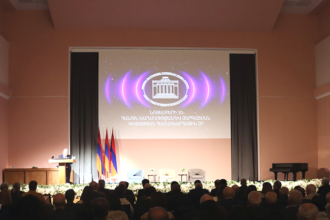 ՀՀ ԳԱԱ ակադեմիկոս քարտուղար, թղթակից անդամ Արթուր Իշխանյանն իր ելույթում կոչ արեց նոյեմբերի 10-ը հռչակել պետական տոն։ «Անհրաժեշտ է խորհել անցած ուղու և ապագայի մասին, և այդ խորհելու թեման թելադրում է ՅՈՒՆԵՍԿՕ-ի այս տարվա խորագիրը՝ «Վստահություն, վերափոխում և ապագա․ գիտություն, որն անհրաժեշտ է մեզ 2050 թվականին»։ Մեզ անհրաժեշտ է խորհել գլոբալ մասշտաբով անելիքների մասին։ Այս տեսանկյունից կարևոր է գիտակցել, որ գոյություն ունի պատմության արագացման օրենք։ Դարաշրջանների տևողությունը մշտապես կրճատվել է, և եթե վաղնջական ժամանակներում պատմական դարաշրջանները ձգվել են հարյուր հազարավոր տարիներ, ապա հետագայում կրճատվելով հասել են 20-30 տարվա շեմին, ինչը հավասարվում է մարդու զարգացման կենսաբանական ժամանակին։ Եվ քանի որ պատմական դարաշրջանն այլևս կրճատվել չի կարող, 2050 թվականին մարդկությունը մոտենում է սինգուլյարության (եզակիության) կետի։ Սա նշանակում է, որ մարդկության զարգացման ընթացքում տեղի է ունենալու արմատական փոփոխություն։ Նկատենք, որ նախորդ դարաշրջանների հեղափոխական շրջադարձերը եղել են մարդկության ներսում՝ առանց մոլորակի գոյության սպառնալիքի։ Այսօր մենք գործ ունենք միանգամայն այլ իրավիճակի հետ, երբ զարգացումը վտանգում է մոլորակի գոյությունն ընդհանրապես։ Առաջ են եկել այնպիսի վտանգներ, ինչպիսիք են միջուկային և էկոլոգիական տեխնածին փոփոխությունները։ Միաժամանակ, առաջացել են նոր հնարավորություններ, ինչպիսիք են գենային ինժեներիան և արհեստական բանականությունը, որոնք ընդունակ են լուծելու մարդու հիվանդությունների խնդիրը, երկարացնելու կյանքը։ Զուգահեռ, այս նույն հնարավորությունները նոր ռիսկեր են առաջացնում։ Կարող է տեղի ունենալ մարդ տեսակի դիխոտոմիա (երկճյուղում), երբ գենային ինժեներիայի կիրառմամբ մարդկանց մի մասը կվերածվի «խոնարհ մարդու», որը ոչնչի կարիք չունենա։ Նույն գենային ինժեներիայի կիրառմամբ կարող է ստեղծվել նաև «գերմարդու» տեսակ։ Այսօր մարդկային գործունեության շատ ոլորտներ մենք հանձնում ենք արհեստական բանականությանը, և այդ արհեստական բանականությունը կարող է մի օր՝ տեսականորեն, սկսել գործել ինքնուրույն և որոշել, որ մարդն այլևս ավելորդ է այս մոլորակի վրա։ Այս մասին ճիշտ նույն բառերով ասված է Ստիվեն Հոքինգի, Իլոն Մասկի և 150 այլ առաջատար գիտնականների 2016 թվականին հրապարակած բաց նամակում։ Նրանք զգուշացնում էին մարդկությանը հնարավոր արմատական փոփոխությունների մասին։ Միաժամանակ նշում էին, որ այս մարտահրավերներին դիմակայելու համար անհրաժեշտ են ոչ միայն տեխնոլոգիական, այլև հումանիտար լուծումներ․ մարդկային գիտակցությունն ու բարոյականությունը պետք է վերահսկեն տեխնոլոգիական հզորությունը։ Այդ պատճառով խստորեն կարևորվում է հումանիտար ոլորտի զարգացման անհրաժեշտությունը։ Գիտությունն է հանդիսանում և՛ խնդրի աղբյուրը, և՛ դրա լուծման հնարավոր բանալին։ Այո՛, նոր վտանգները ծնվել են գիտությունից, բայց հենց գիտությունն է, որ ի վիճակի է դրանք հաղթահարելու», -  ասաց Արթուր Իշխանյանը։