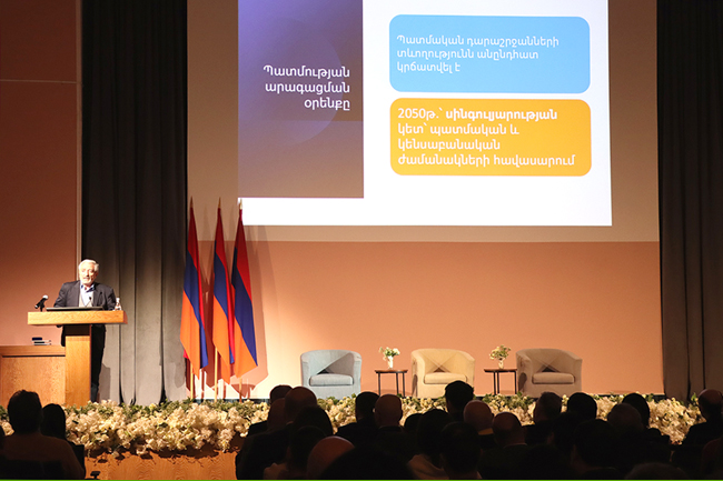 Նա նշեց, որ առաջիկա 25 տարին բնութագրվելու է գլոբալ աշխարհակարգի փոփոխությամբ, ինչն այսօր արդեն իսկ տեղի է ունենում՝ պատերազմներով, ցավով, արյամբ։ «Այն շարունակվելու է դեռ երկար տարիներ։ Մեզ այն հիշեցնում է 20-րդ դարի դառը փորձը՝ Հայոց Ցեղասպանությունը, երբ աշխարհակարգի փոփոխության պահին մենք չկարողացանք դիմակայել մարտահրավերներին։ Այսօր պետք է պատրաստ լինենք՝ գիտությամբ, գիտակցությամբ և միասնականությամբ։ Բացի այդ, մենք նաև տեղային առանձնահատկություն ունենք․ ագրեսիվ շրջապատ, ռեսուրսների ասիմետրիա մեր շրջապատի հետ, հետևաբար, մեզ անհրաժեշտ է ապավինել գիտությանը, մի ուժի, որն ավելի զորեղ է, քան նյութական ուժը, քան թվերը», - նշեց Արթուր Իշխանյանը։